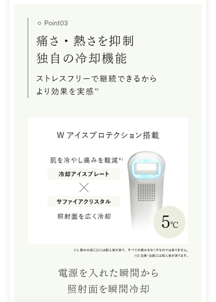 ・「5℃冷却プレート」と「サファイヤクリスタル」による「Wアイスプロテクション」で痛さと熱さをやわらげる。