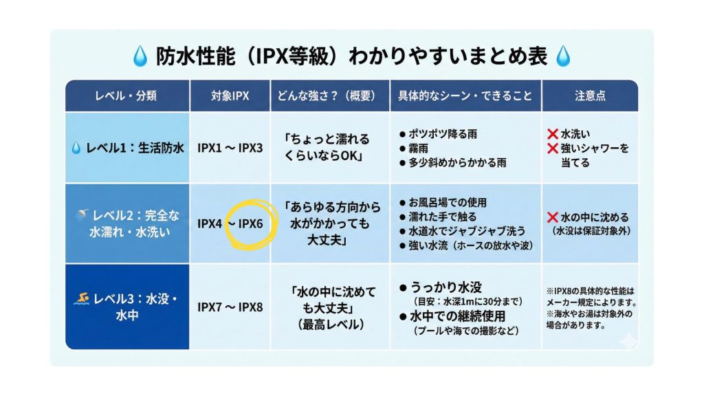この「IPX6」がどれくらいの防水なのかな?