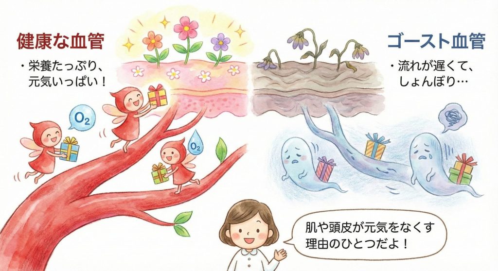 この流れが弱まった状態が「ゴースト血管」と呼ばれることもあり、肌や頭皮が元気をなくして見える理由になります。