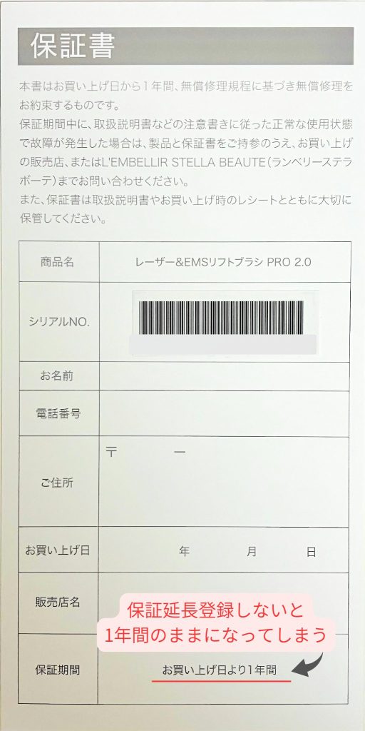 ステラボーテリフトブラシの保証期間は基本は1年間ですが、公式の手続きを行うことで、実質2年間の保証が受けられます。
